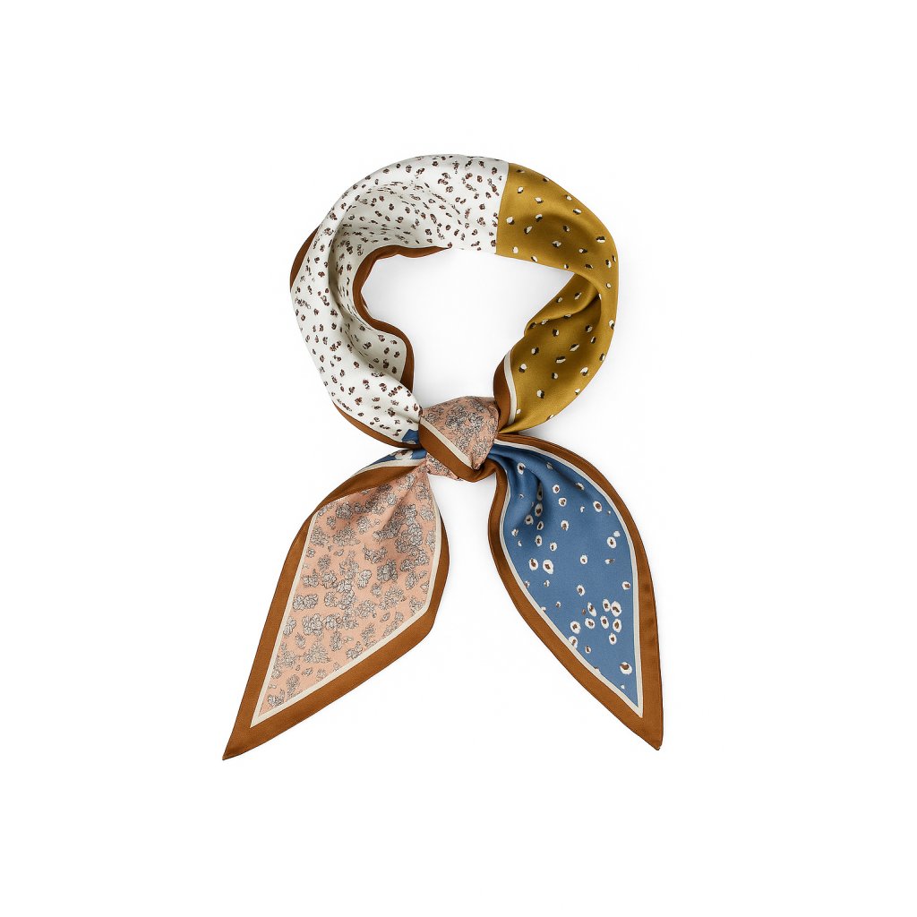 Tento elegantní saténový šátek zaujme kombinací jemných přírodních tónů – hnědé, modré, béžové a olivové – doplněných decentními motivy.