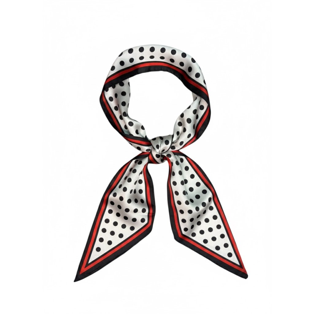Kombinace bílého základu s černými puntíky a červeným lemem působí stylově a nadčasově. Šátek lze nosit na mnoho způsobů – kolem krku, do vlasů, na kabelku či zápěstí.
