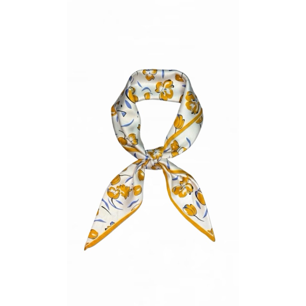 Dodejte svému stylu špetku elegance s tímto saténovým šátkem v hořčicově žlutých tónech.